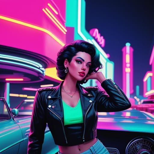 This image showcases a woman in a vintage convertible on a vibrant, neon-lit street with a glowing skyline at dusk, rendered in a dynamic, high-detail 80s aesthetic.