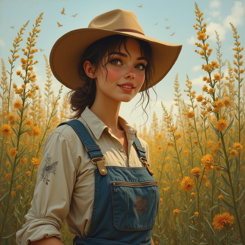 Easily create your own images of women working on a farm, wearing work clothes and purple Hunter boots with our free AI generator.