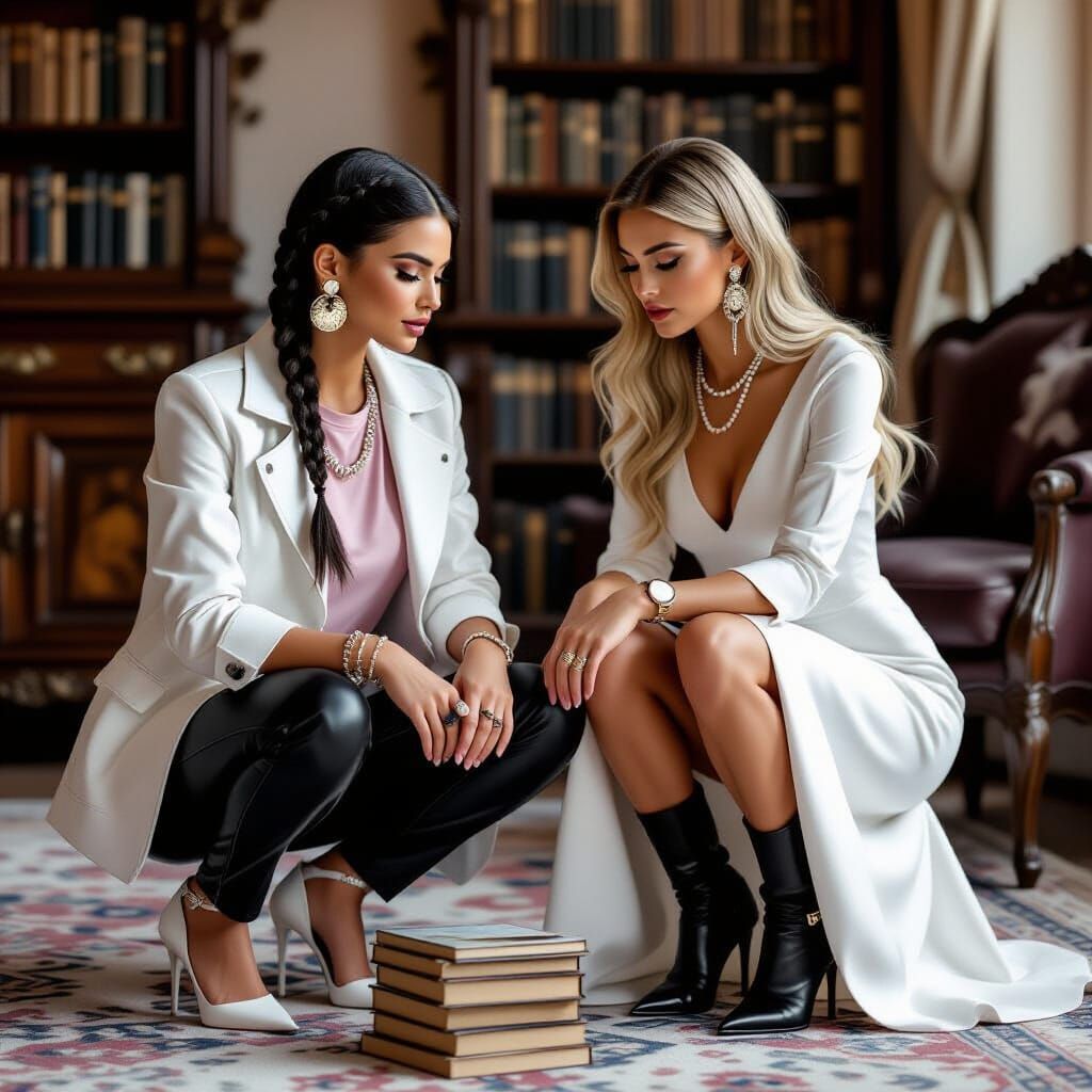 This photorealistic image captures two women squatting and sorting books among antique furniture. Features include detailed attire, natural lighting, and sharp focus for an ultra-detailed 8k resolution.