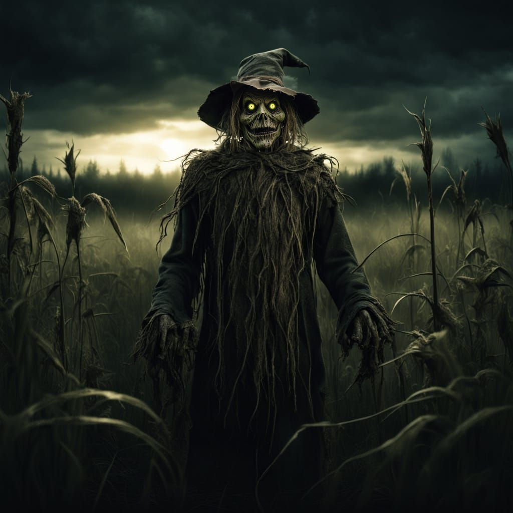 A realistic scarecrow with decaying skin and glowing eyes stands alone in tall grass under a stormy sky, embodying cursed horror realism.