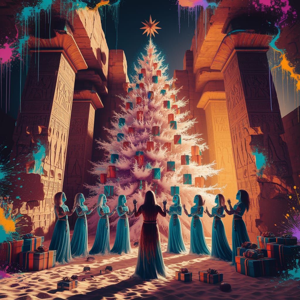 A vibrant photograph merges Christmas and Halloween in ancient Egypt with undead carolers and a ghostly tree. Graffiti art style with splash and melting paint effects.