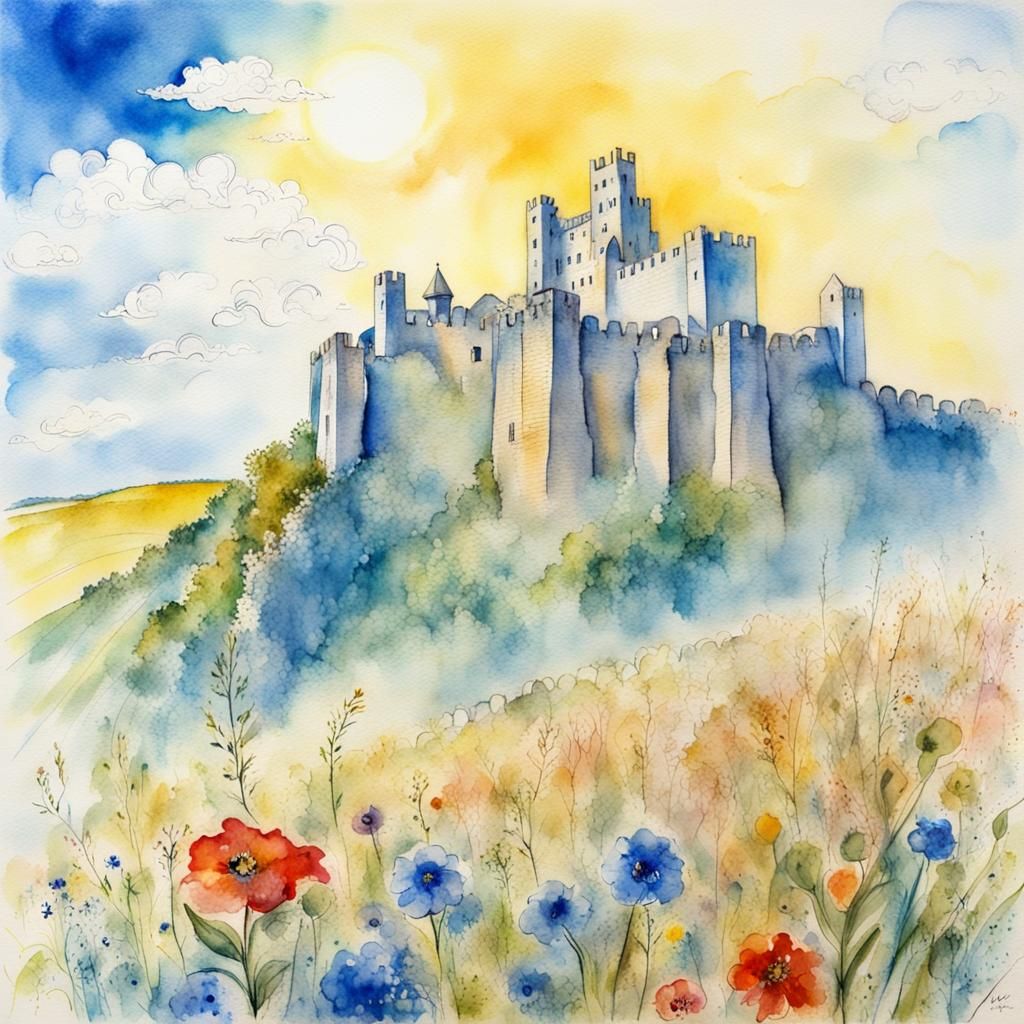 A watercolor line drawing of Spis Castle under a bright blue sky. The artwork features soft, divine lighting and floral elements, creating a heavenly and bright atmosphere.