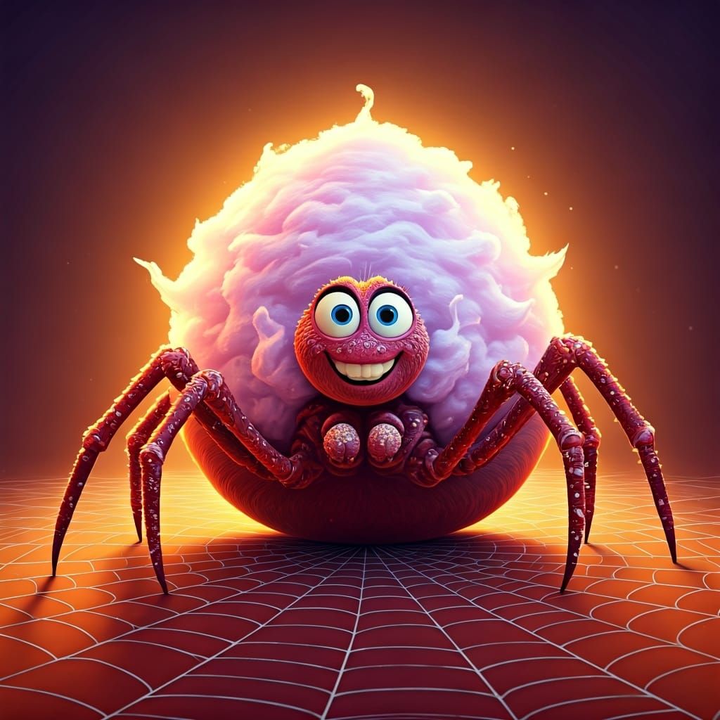 A whimsical image of a spider made of candy and sweets, sitting in a cotton candy web. The 3D render features bright colors and a radial gradient background, reminiscent of Pixar concept art.