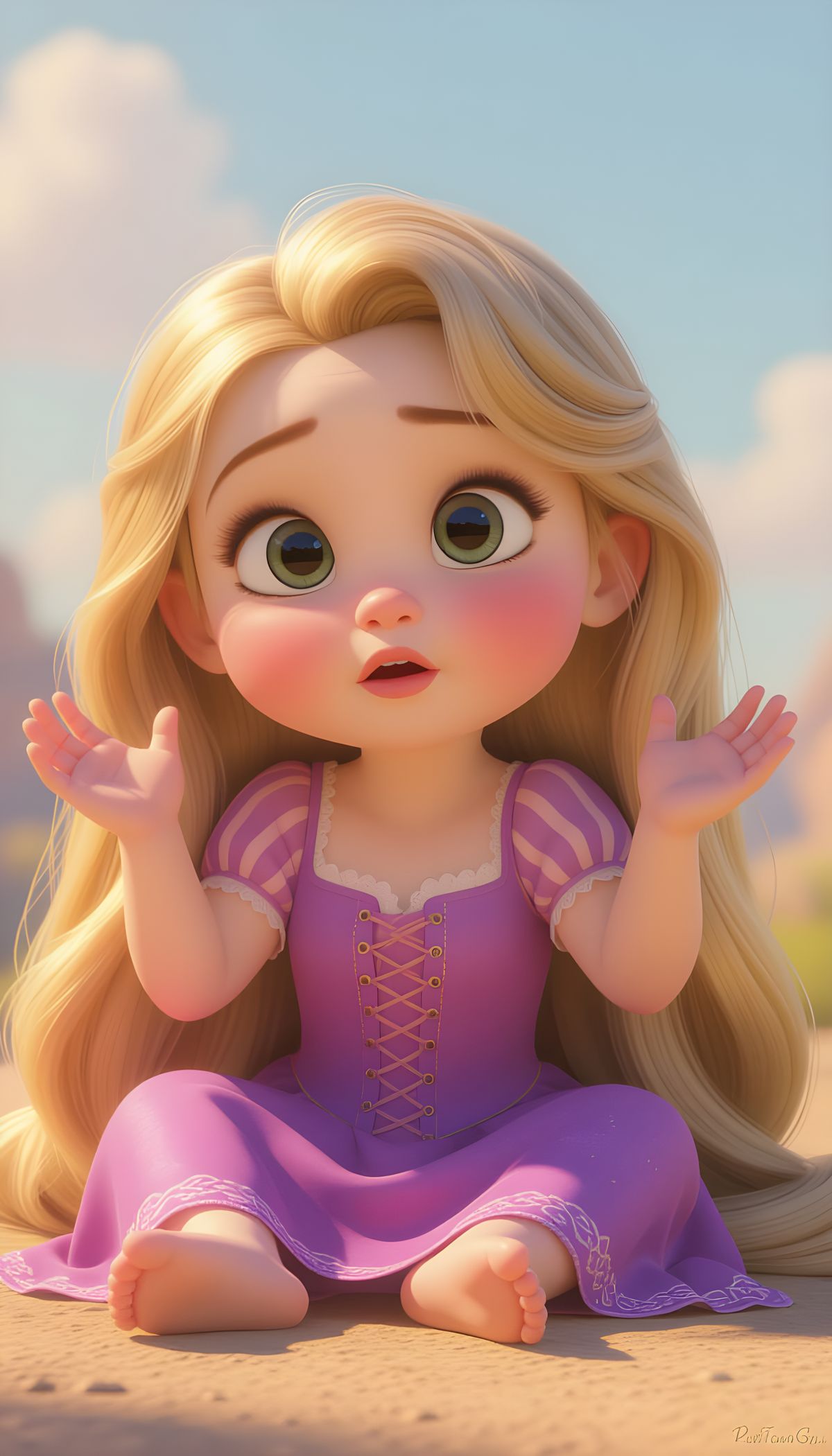 This image features a hyper-realistic, close-up portrait of a baby Rapunzel in a Pixar style. It showcases extremely detailed, soft features with big expressive eyes and chubby cheeks against a clean pastel background.