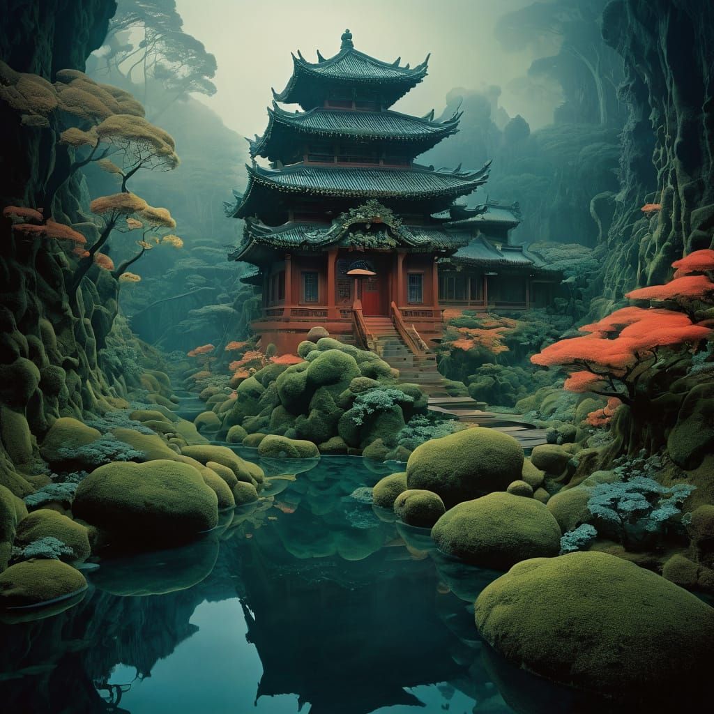 This image blends the Art Nouveau elegance of Mucha, the minimalist graphic design of Nagai, and the atmospheric photography of Keever for a unique visual experience.