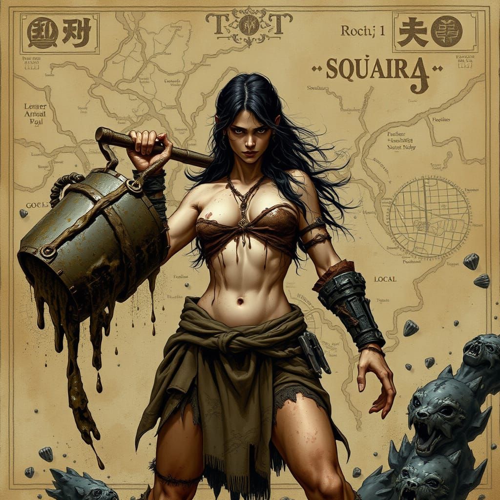 This image depicts a fierce, scantily clad warrior woman wielding a muck bucket. The gritty, fantastical artwork suggests she is drawing power from an ancient map in a Frazetta-esque style.