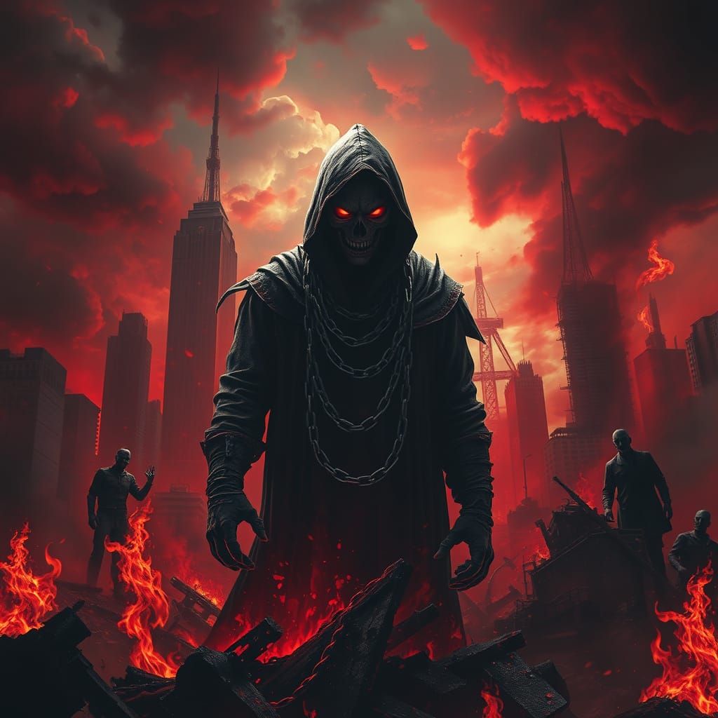 A striking picture of a hooded figure emerging from flames in a ruined, dystopian landscape. The image features dramatic lighting and a gritty, surreal style with gothic and industrial elements.