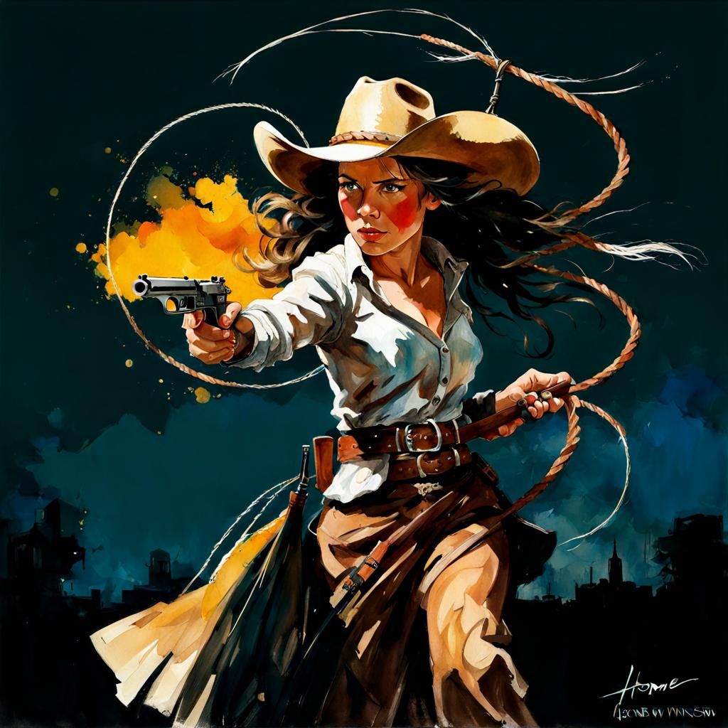 A dynamic watercolor painting of a cowgirl in the Wild West. She is twirling a lasso, shooting a pistol, and posing dramatically against a sun-blazed desert backdrop in a surreal style.