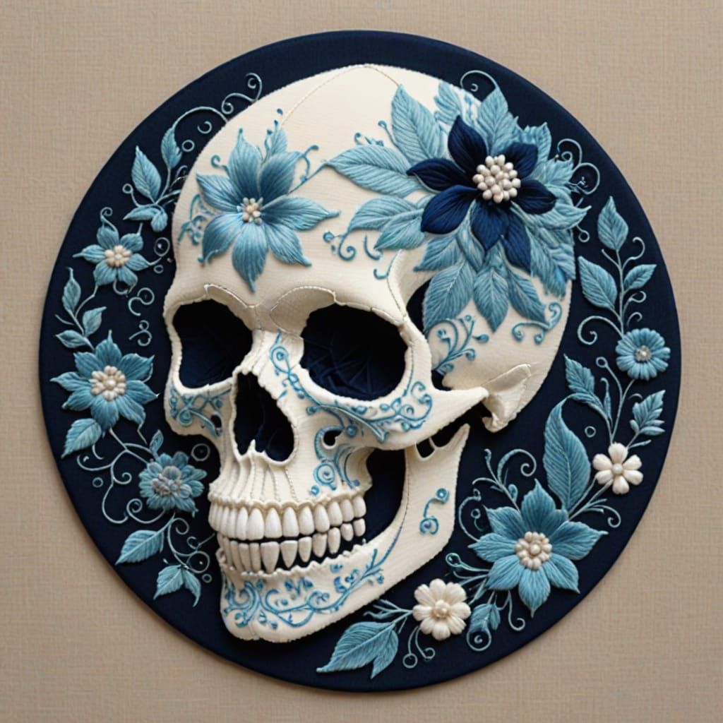 This image shows a white skull interwoven with haptic blue floral needlework. The digital art is rendered in a luminous style, reminiscent of intricate textile art.