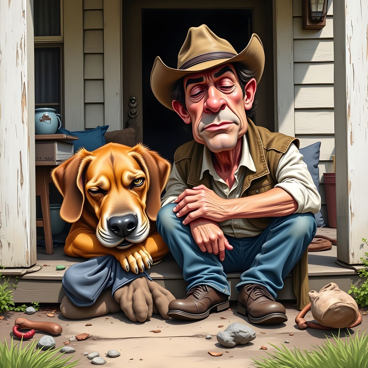 This image shows a caricature of a lazy farmer and his dog asleep on the front porch of a farmhouse. The focus is sharp, capturing the peaceful naptime scene.