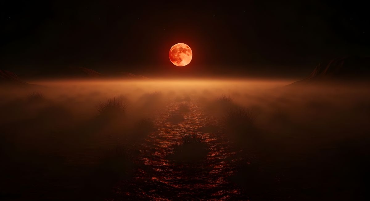 An ultra-detailed crimson moon hangs ominously overhead, its surface etched with deep grooves that seem to drip with dark, viscous blood. Below, a ground mist swirls around, casting eerie shadows and adding to the post-apocalyptic atmosphere. Volumetric lighting bathes the scene in an ominous, warm glow, ...