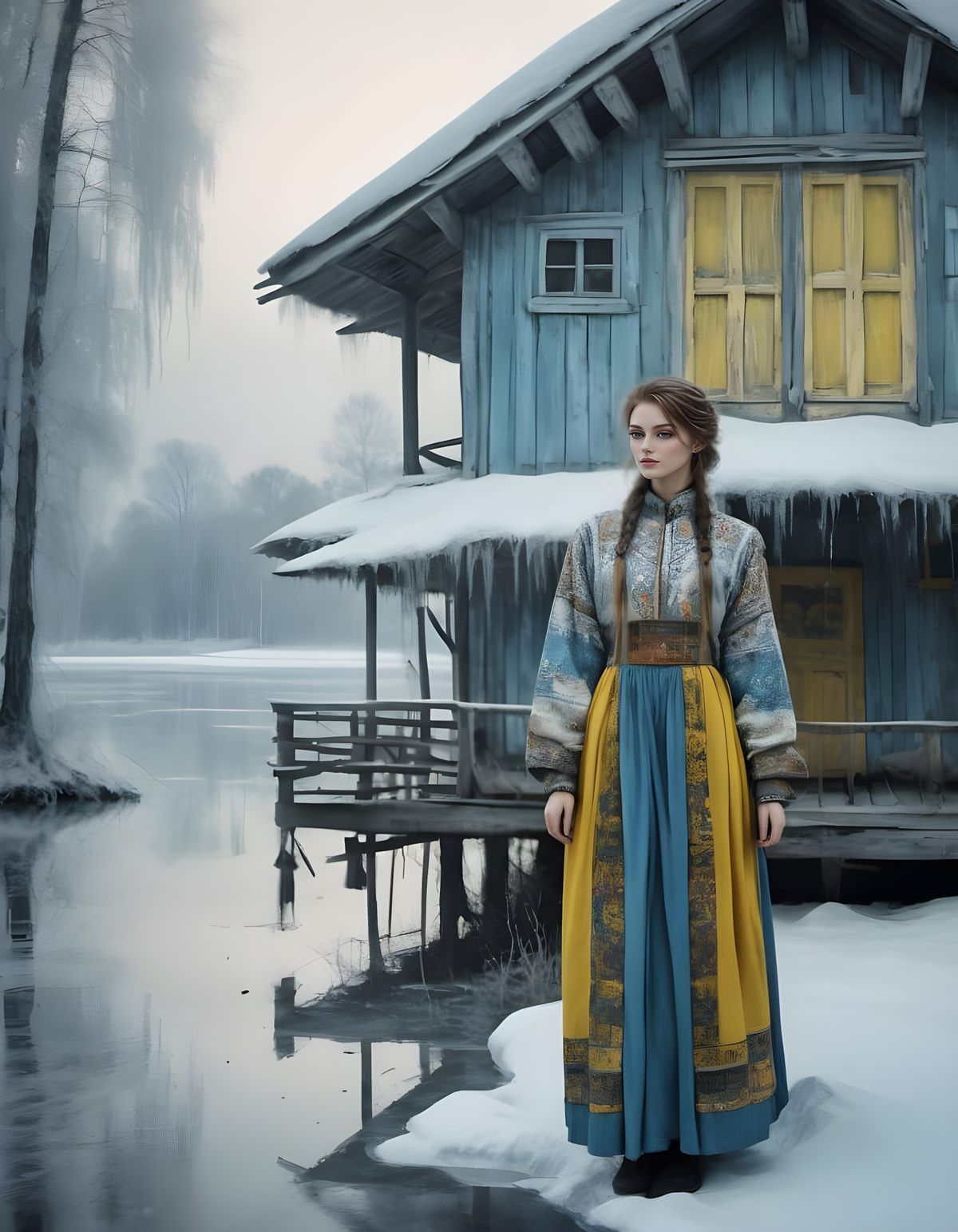 This image shows a snow-covered Ukrainian house by a frozen lake, with a woman in traditional dress. Evokes a soft, nostalgic feel through double exposure and a blend of pale blues, yellows, blacks, and whites, in a textured, maximalist style.