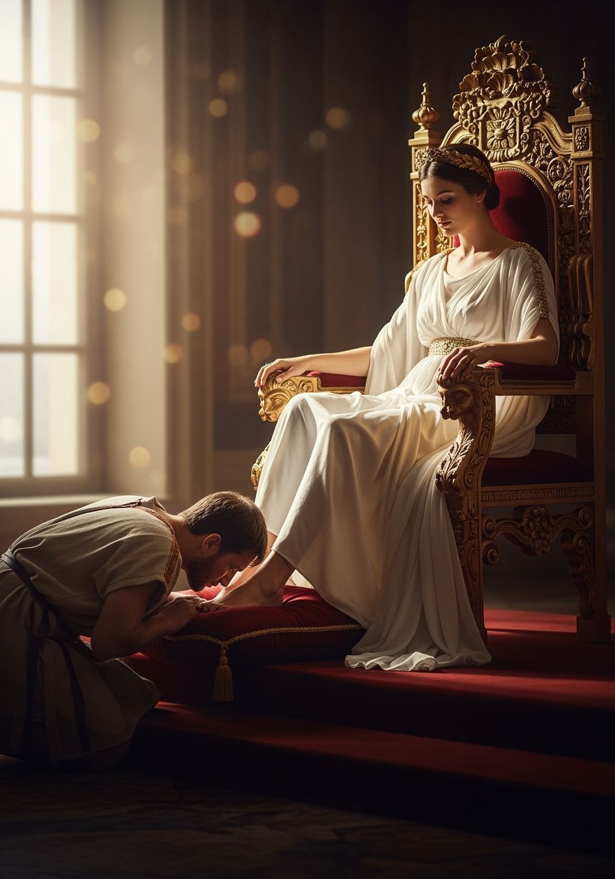 This image shows a Roman Empress on a throne, with a servant kneeling before her. The composition uses natural light and a shallow depth of field, similar to classical paintings.
