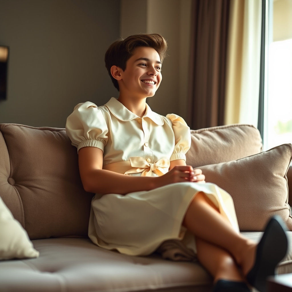 A happy young man with masculine features relaxes on a couch in a Peter Pan collar dress and heels, watching TV. Captured with high clarity and a soft, natural light.
