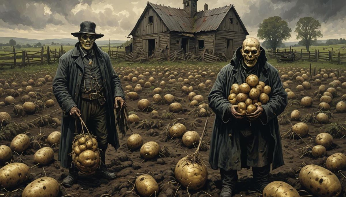 A sinister image of a gothic Irish farm with a potato horror theme. This artwork evokes a dark and unsettling atmosphere through detailed and dramatic rendering.