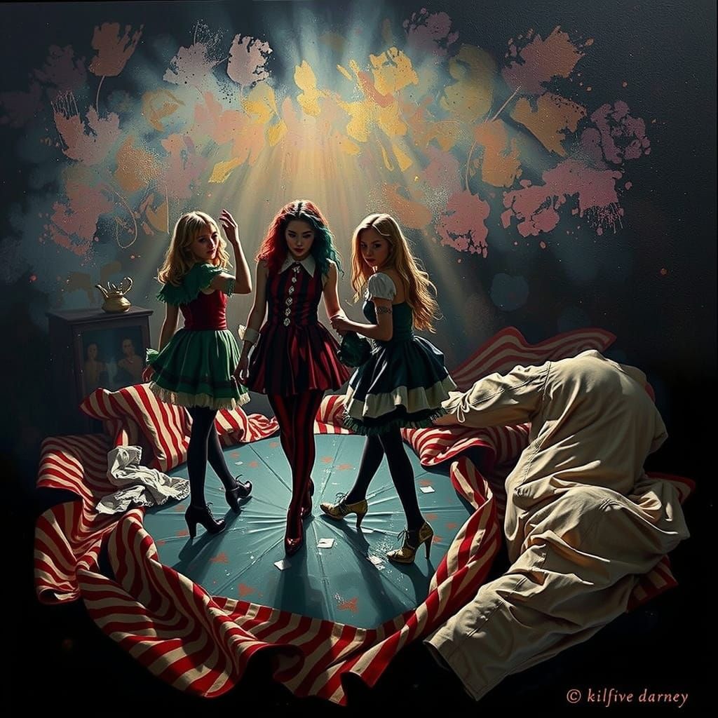 This image showcases a hyperrealistic design with dynamic lighting, featuring bold red, white, and pink stripes in a neapolitan and harlequin carnival style.
