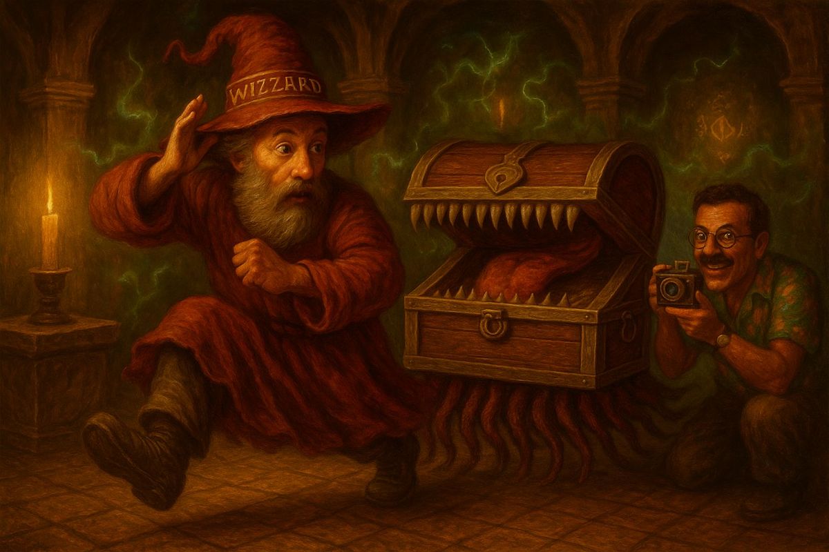 A baroque oil painting on canvas shows the Luggage, a sapient chest, sprinting through Unseen University. A frazzled wizard flees while a tourist pauses to photograph the scene. The image features impasto brushwork and chiaroscuro lighting.