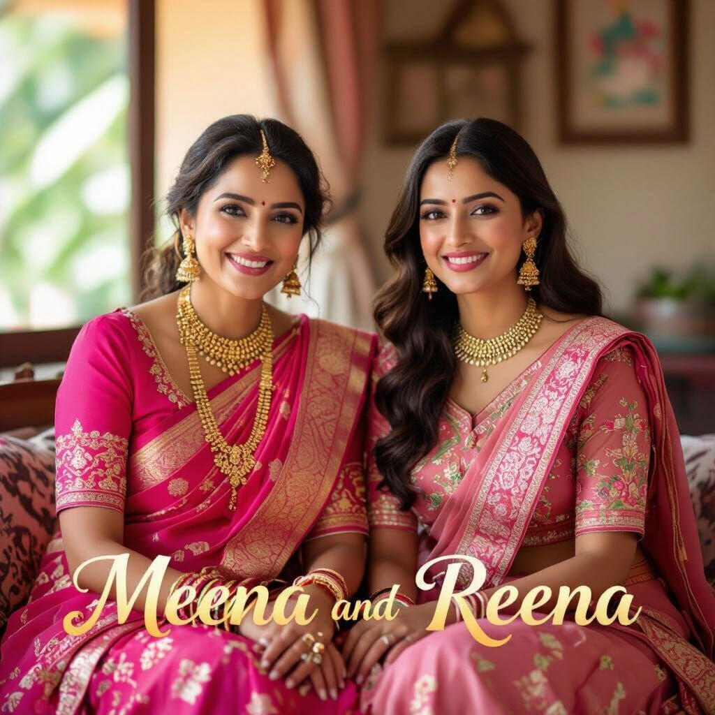 This image shows two village women in traditional pink Indian clothing, smiling warmly indoors. The artwork evokes classical Indian painting with vibrant colors and modern design elements, enhanced by smooth skin tones and soft lighting.