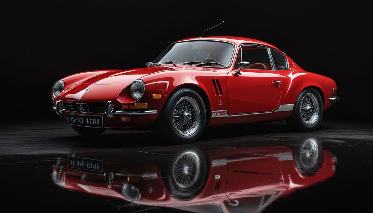 A hyperrealistic painting of a ruby red 1972 Alpine A110 sports car. The artwork features dramatic lighting and intricate detail, evoking power and elegance in a dark, moody setting.