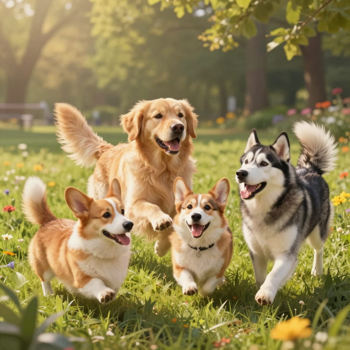 This image shows various dog breeds playing in a park during golden hour. Rendered with exquisite detail in a realistic digital painting style, it captures their playful energy.