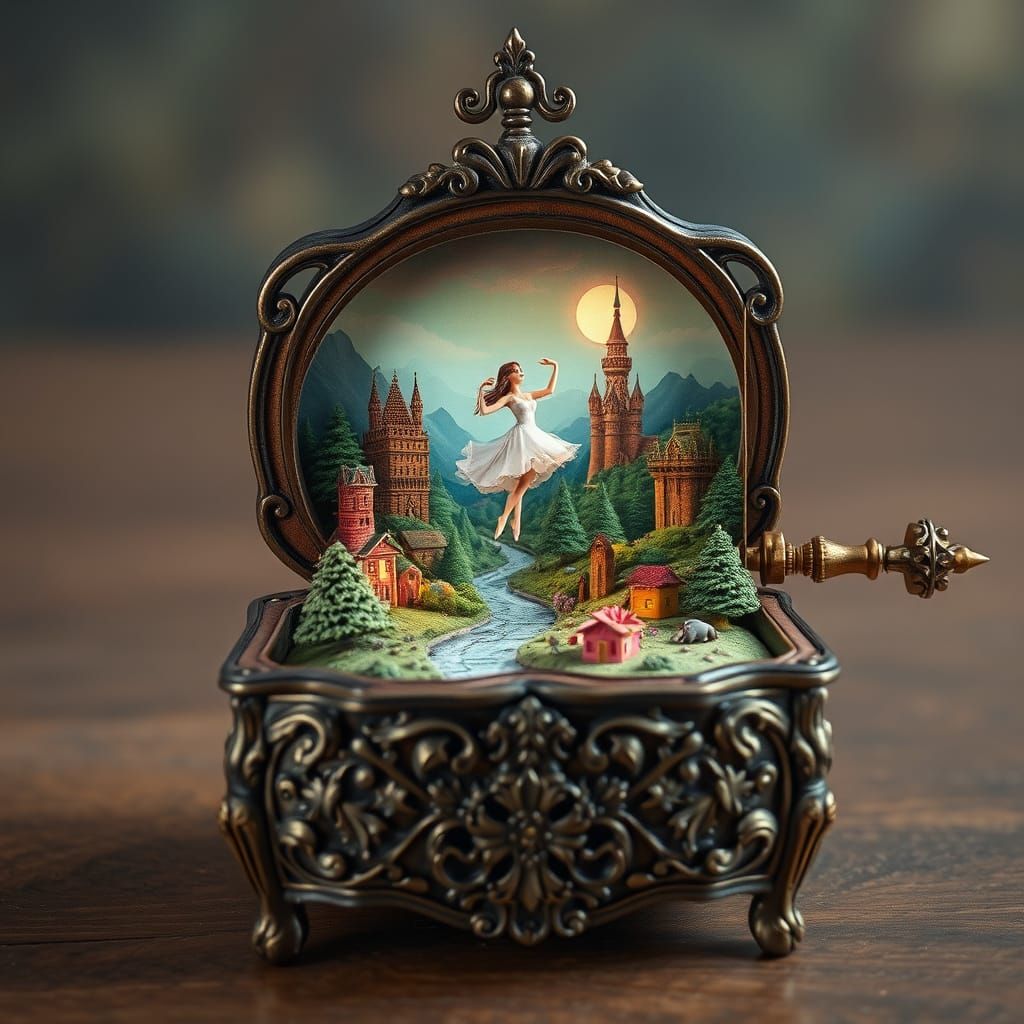 This image shows a vintage music box with a delicate ballerina, opening to reveal a fantastical world of rolling hills, towering spires, and winding rivers, crafted in a delicate, filigree-like style with soft, warm lighting and a sense of wonder.