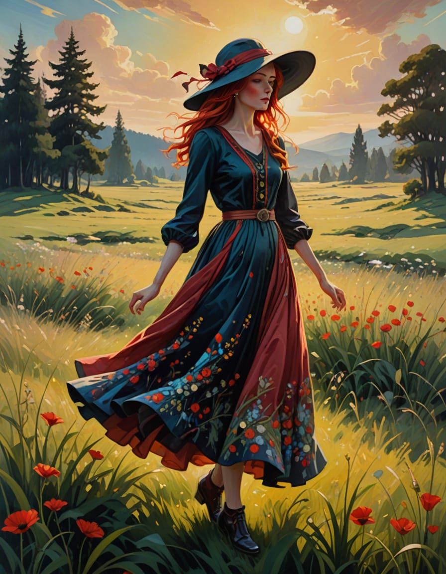 This vibrant oil painting depicts an elegant woman with red hair in a colorful, flowing dress and hat, standing in a sunlit meadow with long shadows. Features art nouveau style and jewel tones.