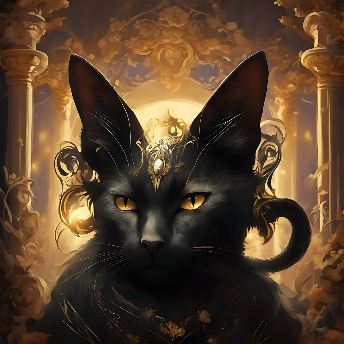 A majestic black cat with striking golden eyes gazes intently forward. Adorned with an ornate golden crown featuring a central gem, the cat's fur is sleek, and it has elegantly curled fur around its ears. The background is ethereal, with softly glowing elements and intricately designed columns, evoking a sense of fantasy and royalty. The overall palette is warm, dominated by golds and soft browns, enhancing the regal presence of the feline.