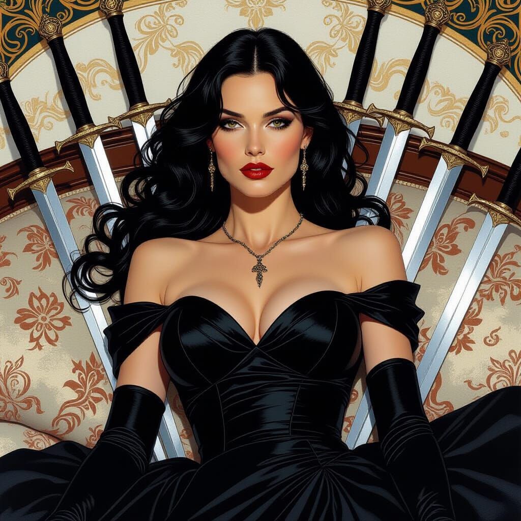 A captivating image of a dark-haired woman in a black dress reclining on a couch amidst swords. The art style evokes gothic mysticism, reminiscent of Alphonse Mucha, with bold lines and cinematic lighting.
