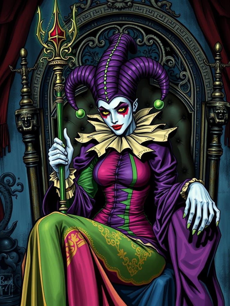 This image shows a sinister female jester seated on a throne, holding a scepter. She wears a traditional purple and green outfit, rendered with contrasting colors in a dark horror aesthetic.
