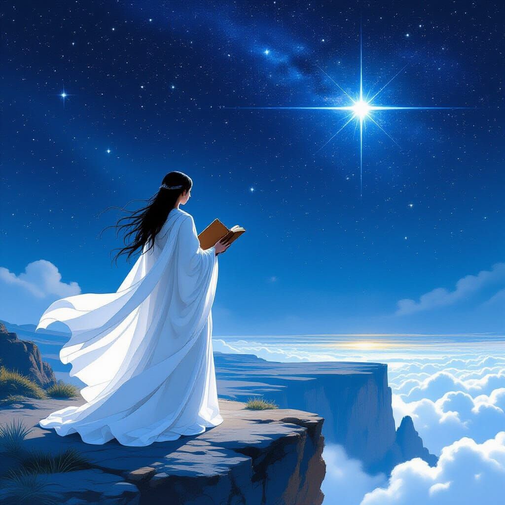 This image shows a woman in white robes holding a book, set against a starry sky. The artwork evokes a surreal, ethereal style with intricate details and cosmic themes.