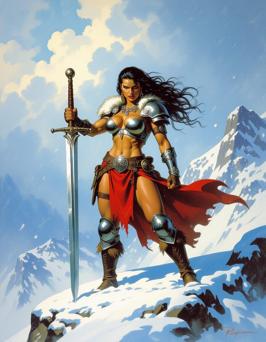 A powerful barbarian queen stands on a snowy mountain, sword raised against a stormy sky. The image evokes classic fantasy art with dynamic composition, bold colors, and raw emotion.
