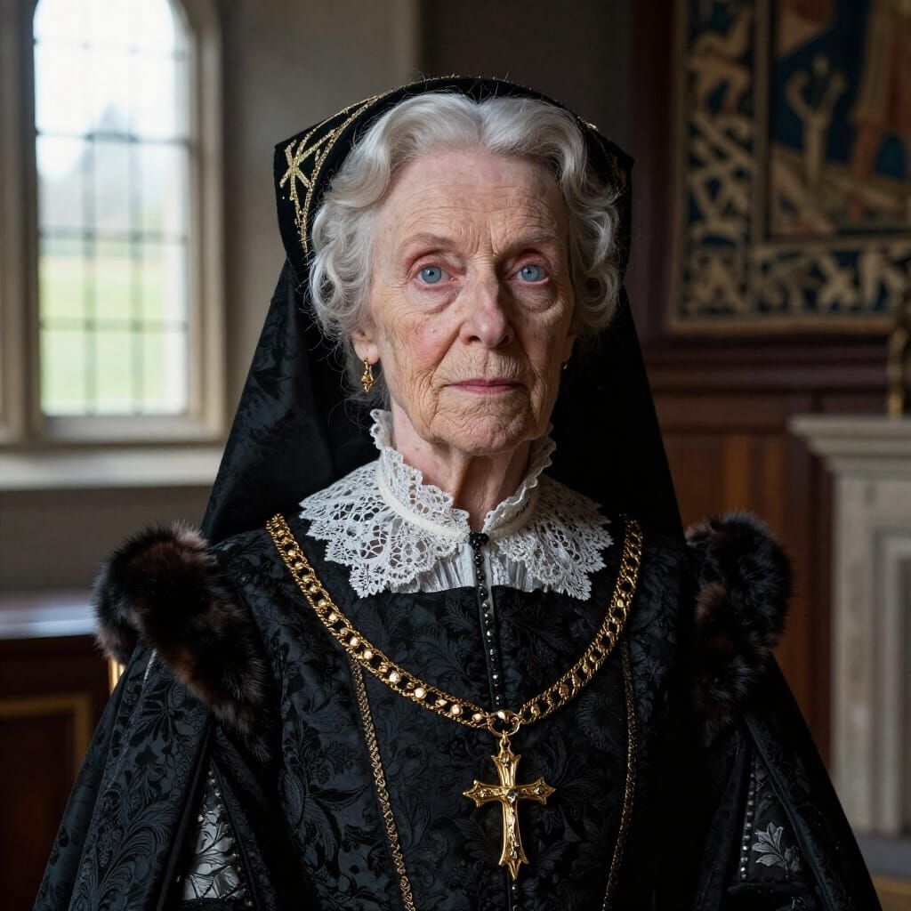 This image shows a photorealistic portrait of an elderly English noblewoman. She has a slender, dignified frame and a wise, alert expression, rendered in a pale, parchment-like complexion.