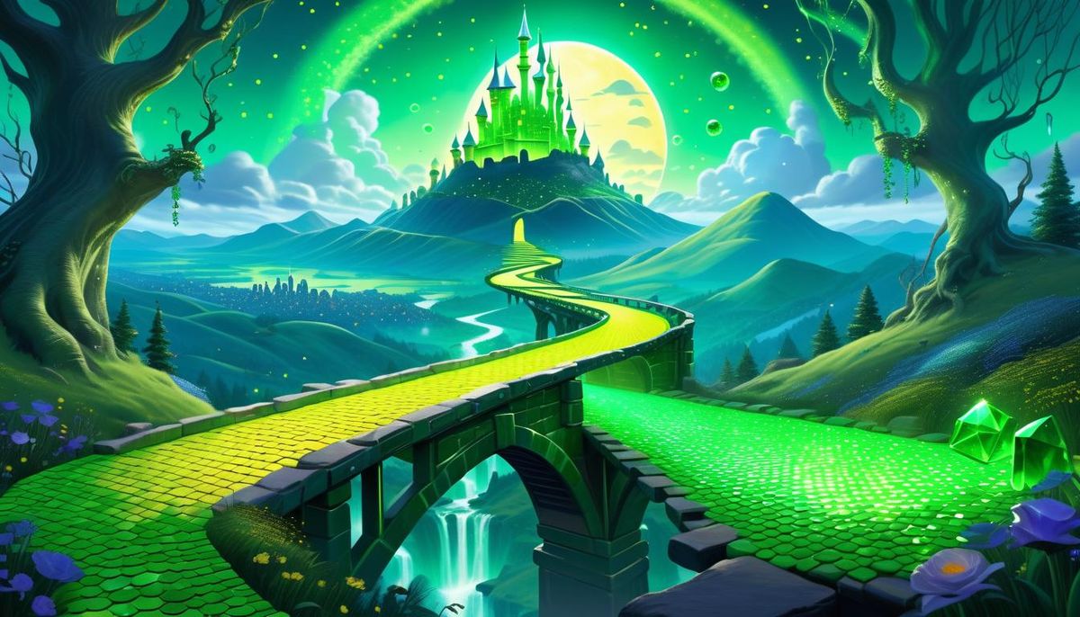 A vibrant image of the yellow brick road extending over a bridge. In the distance, the Emerald City shimmers atop a hill, aglow with fluorescent green and countless emeralds.