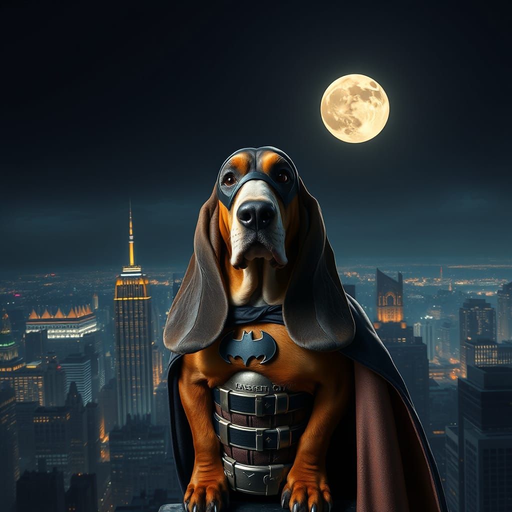 An anthropomorphic Basset Hound vigilante guards a detailed city at night. This cinematic digital matte painting features dramatic lighting and a full moon, evoking heroism.