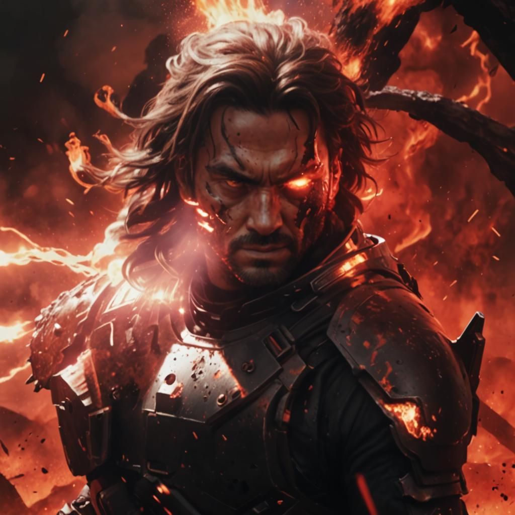 A striking picture of a man in tactical armor fleeing a volcano. The digital art features explosive colors, soot-stained armor, and dynamic backlighting, rendered in a high-definition, action-packed style.