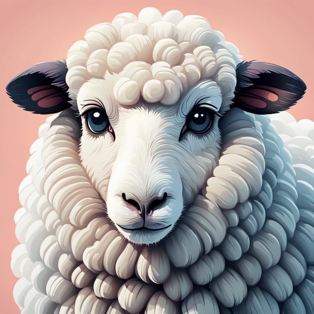 This image shows a sad sheep's face in a minimalist cartoon style. The close-up view features a cute facial expression with soft pastel colors, gentle shading and cartoonish textures, as 2D animation.