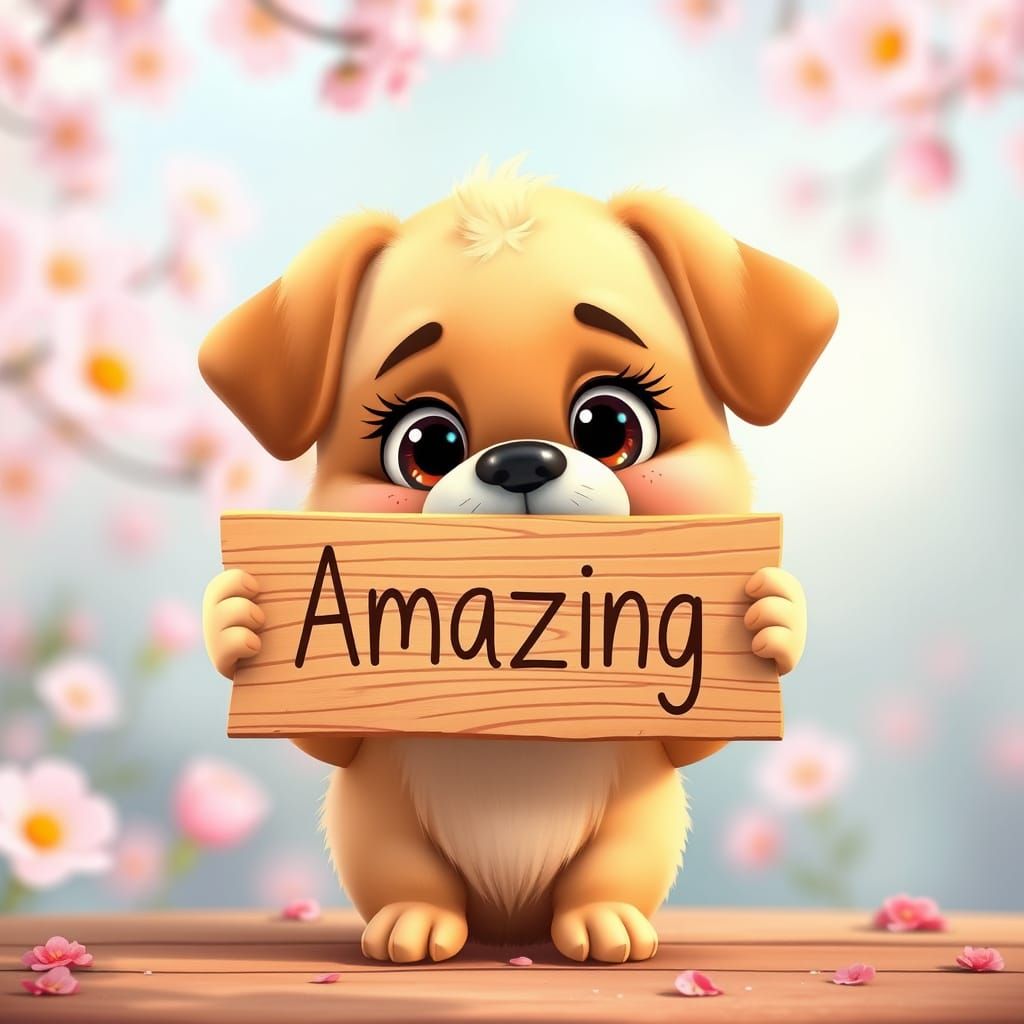 This charming cartoon image features a cute, chubby dog holding a wooden sign with the words 'Amazing' in a romantic spring setting, created in the style of Disney Pixar with soft pastel colors and gentle lighting.