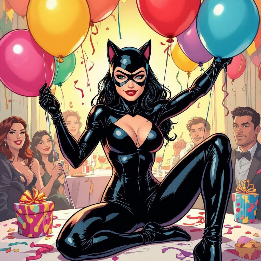 This image shows Felicia Hardy in a black cat suit popping birthday balloons at a party. The stylized illustration evokes the look of Marvel comics with bold lines and dynamic poses.