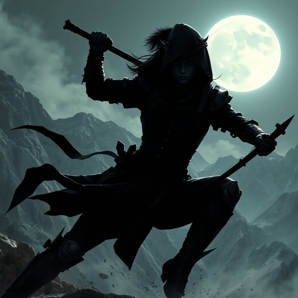 A dark, cloaked warrior silhouetted against a large, glowing full moon in a mountainous, nighttime landscape.