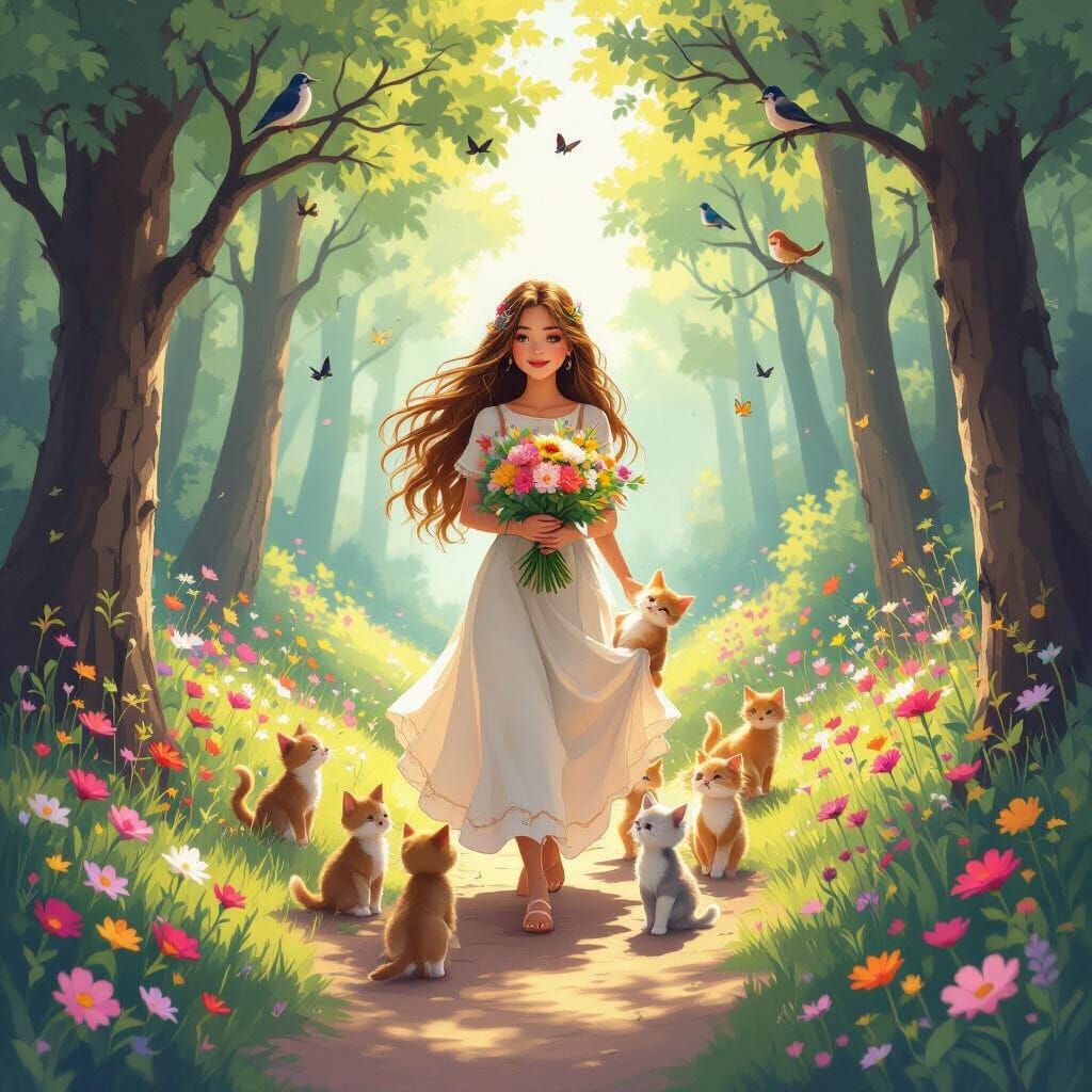 A woman with long tan hair holds flowers and a kitten, leading a procession of playful kittens down a forest path. The scene is bright, painterly, and richly colored, with soft lighting and abundant wildlife.