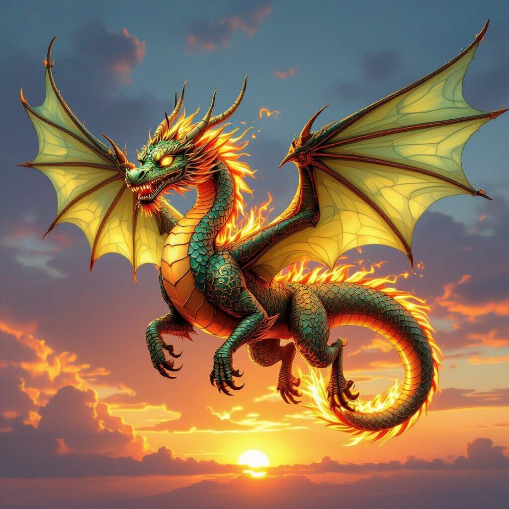 A golden dragon soars across a sunset sky, its metal scales patterned with Scandinavian knotwork. The dragon's wings shimmer with iridescent light green in this hyper-realistic digital artwork.