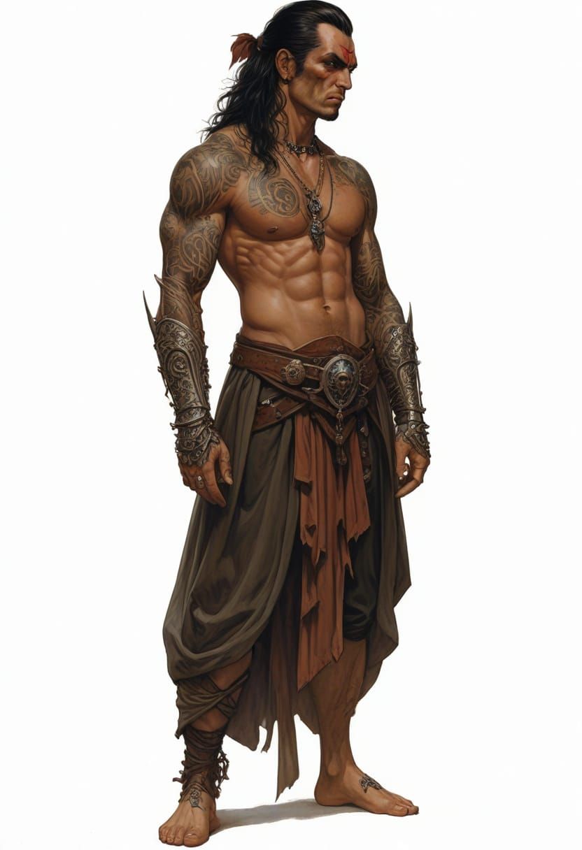 This image shows a barefoot, tattooed character in a heroic fantasy RPG setting. The illustration is highly detailed with black outlines and vivid colors, reminiscent of fantasy art.