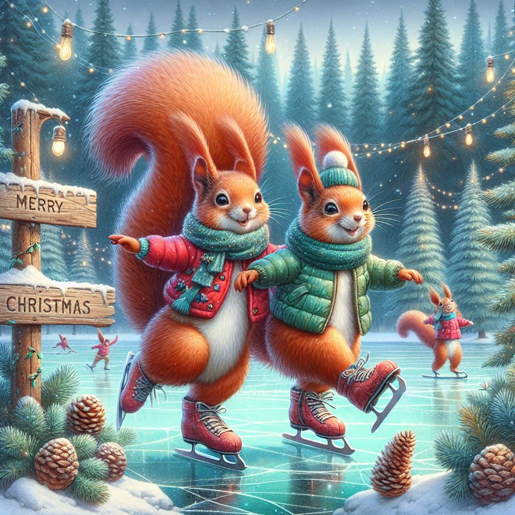 This image shows two red squirrels dressed in Christmas attire skating on a frozen lake. Pine trees with fairy lights and a 'Merry Christmas' signpost enhance the festive, watercolor-style scene.