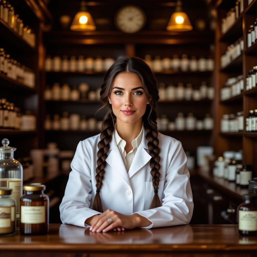 A beautiful Italian woman with braided black hair in a pharmacist's coat sits at a counter in an old Italian pharmacy. The scene features warm colors and soft lighting.