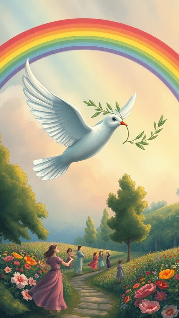 A depiction of a dove carrying an olive branch, with a rainbow above it. The colorful scene features a garden with people, flowers, and trees in a surreal and dreamy art style.