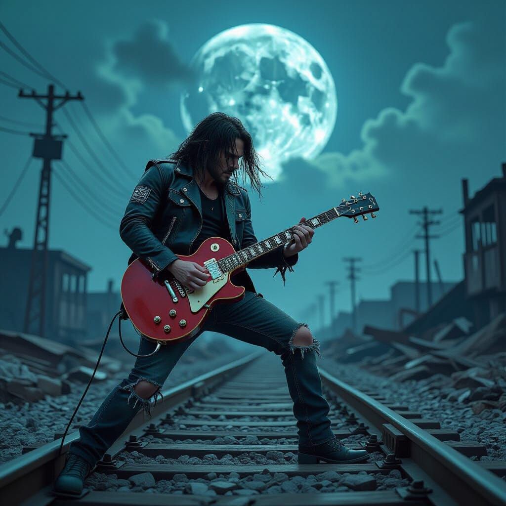 A striking picture of a guitarist resembling Eddie Munson shredding on a speeding train through a ruined world. This digital artwork blends photorealistic rendering with gritty, dystopian aesthetics.