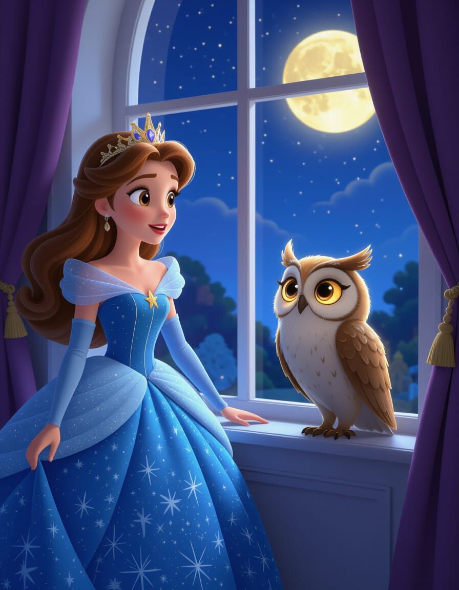 This image shows a princess in a blue gown visited by an owl at night. Moonlight illuminates the scene, rendered in a 3D cartoon style with vibrant colors and soft textures.
