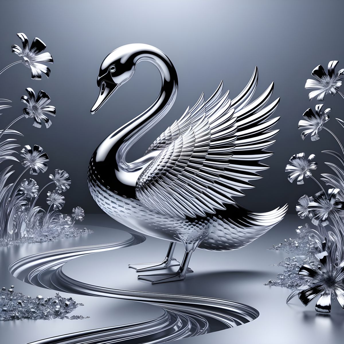 This image shows a majestic swan formed from shining silver chrome, standing in a dreamy chrome landscape. A river flows through the scene, adorned with chrome flowers blending futuristic aesthetics with natural beauty.