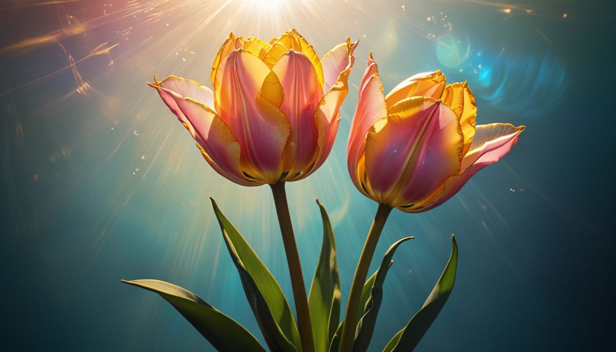 A striking picture of a surreal golden pink tulip with intricate filaments set against a cracked mirror background. The petals reflect a dazzling light with golden threads in an iridescent style.