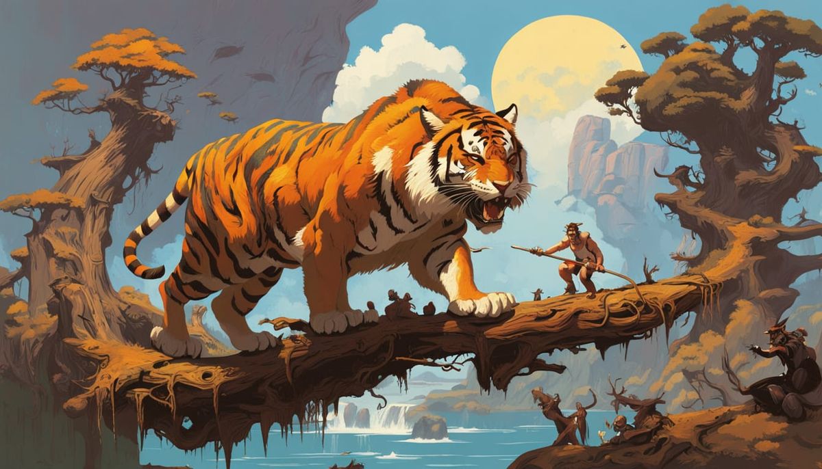 This image depicts a vividly colored, intricately carved wooden huntress riding a saber-toothed tiger. The artwork blends fantasy and realism with detailed textures reminiscent of wood inlay art.